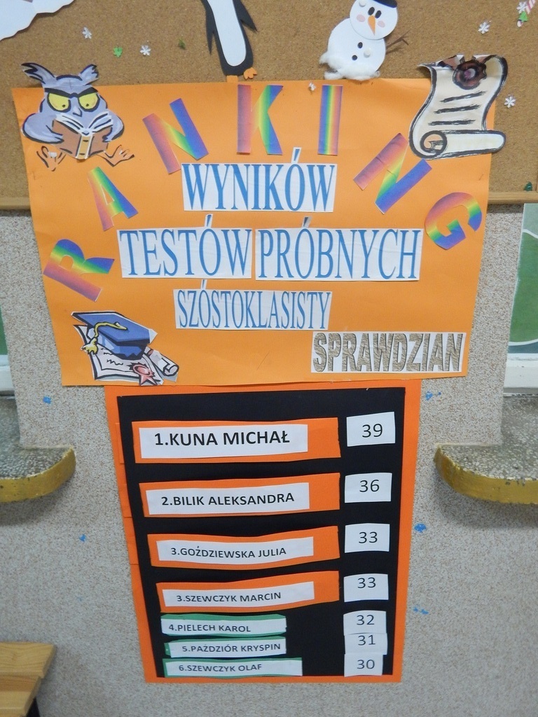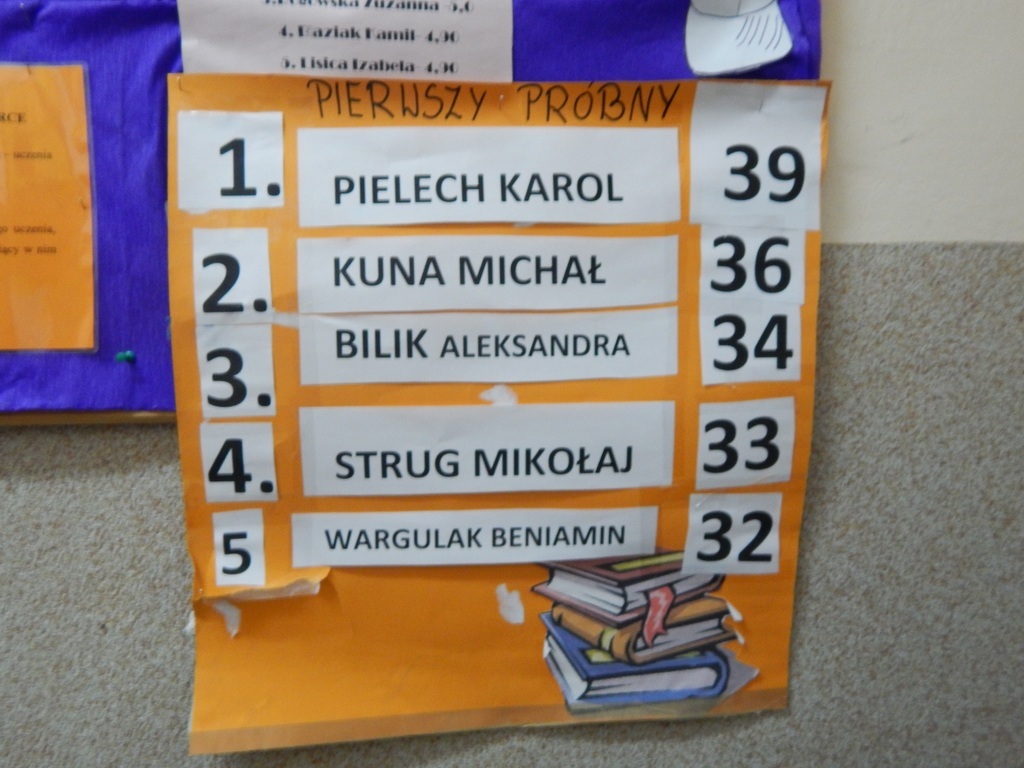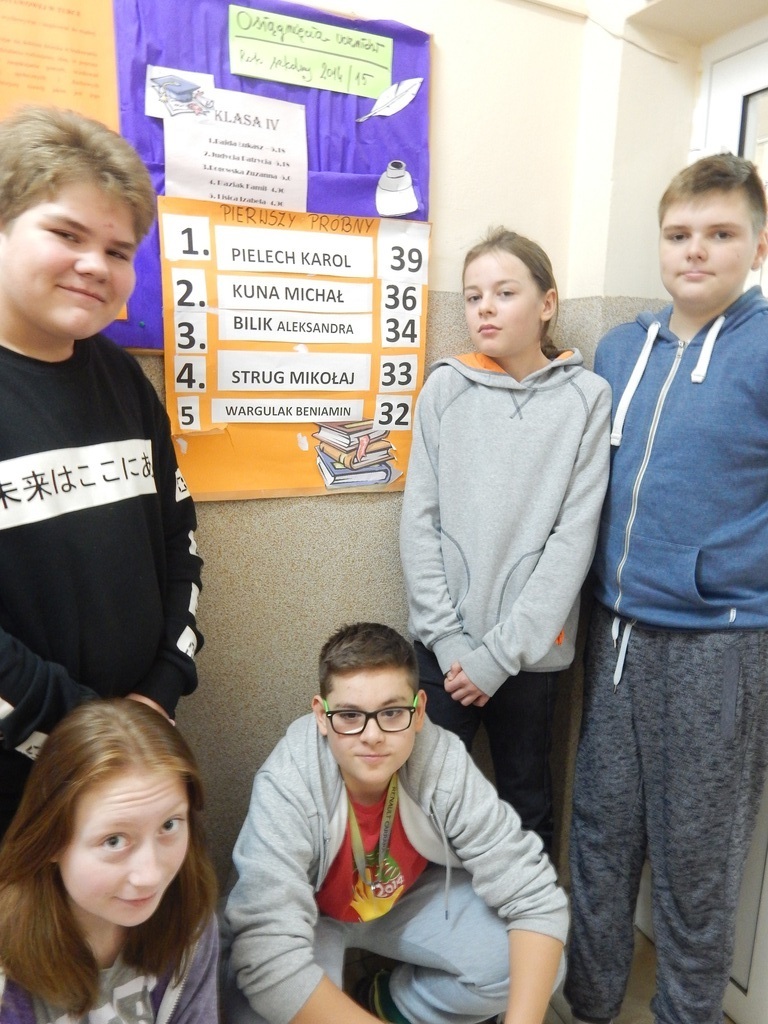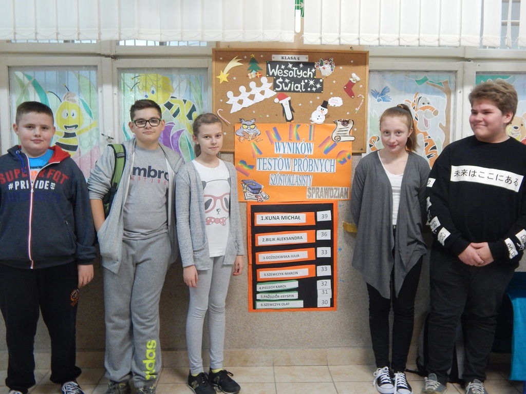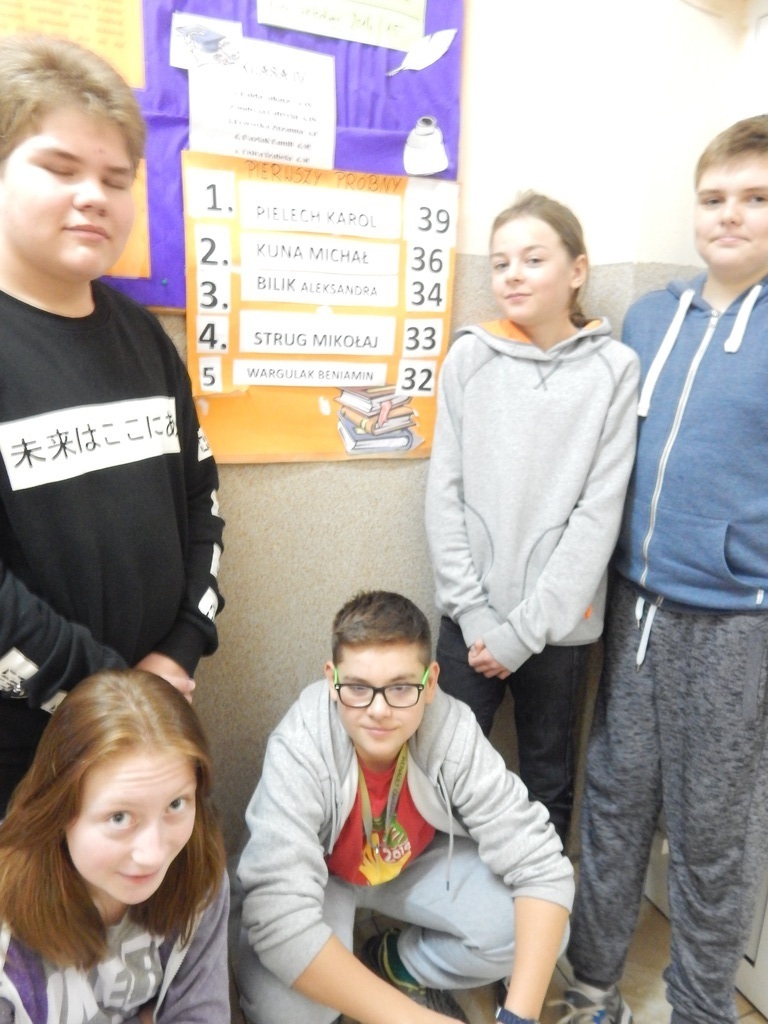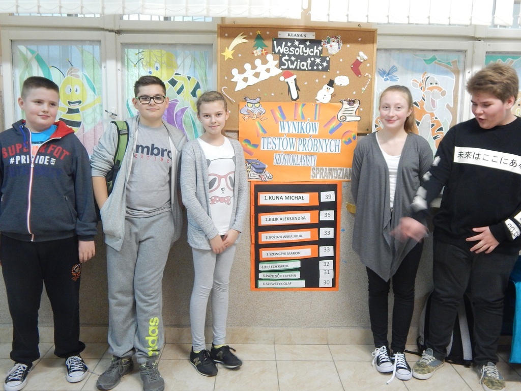 W dniu 4 grudnia 2015 r. w naszej szkole odbył się próbny sprawdzian szóstoklasisty z języka angielskiego z CKE. Najwyższą ilość punktów uzyskał Michał Kuna 39 punktów, na drugim miejscu uplasowała się Aleksandra Bilik z ilością 36 punktów natomiast miejsce trzecie zajęli ex aequo Julia Gożdziewska i Marcin Szewczyk z ilością 33 punkty. WSZYSTKIM SERDECZNIE GRATULUJĘ !