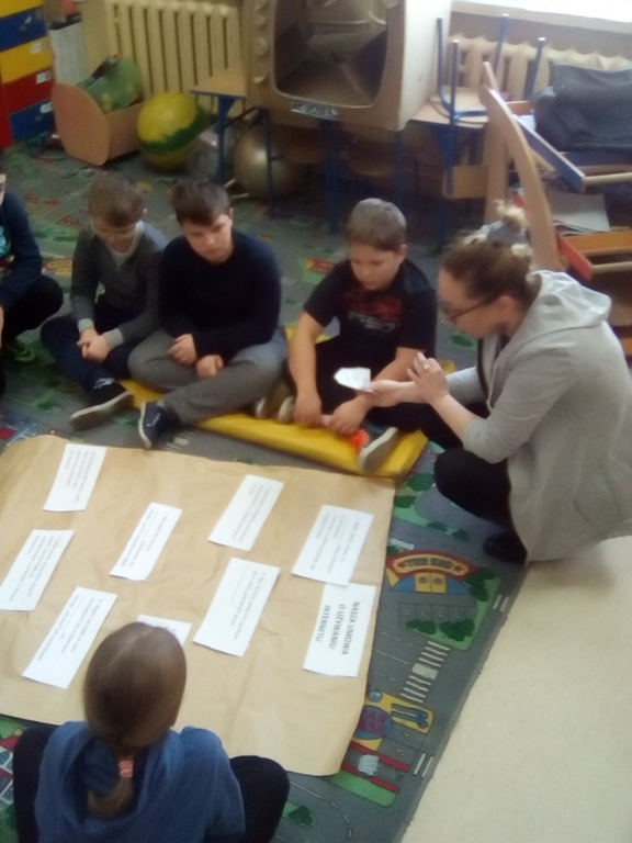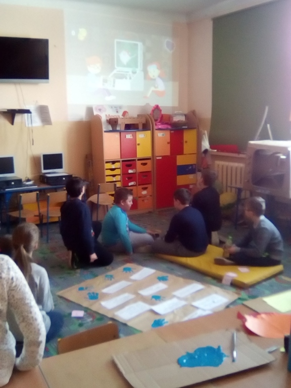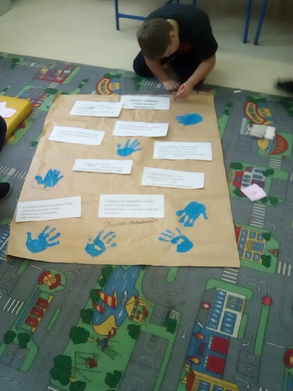 Dzisiejsze zajęcia poświęcone były poznawaniu podstawowych zasad bezpiecznego korzystania z mediów. Dzieci uczyły się, jak zachować się , gdy w sieci zobaczą coś niepokojącego. Rozmawiały o tym , czy i dlaczego warto zawierać z rodzicami kontrakty, czyli deklaracje o używaniu internetu.