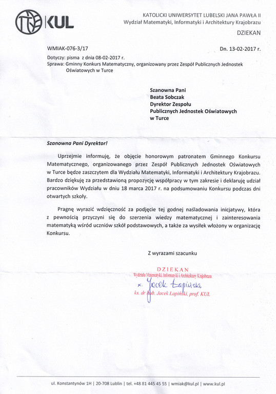 Nasza szkoła organizuje dla wszystkich uczniów z klas I - VI naszej gminy konkurs matematyczny. Honorowy patronat nad konkursem objął Wydziału Matematyki, Informatyki i Architektury Krajobrazu na KUL oraz Wójt Gminy Wólka - Edwin Gortat. Zachęcamy do zapoznania się z regulaminem i wzięcia udziału w konkursie.