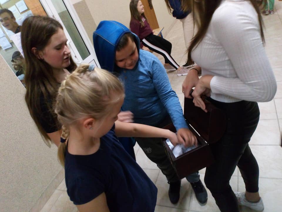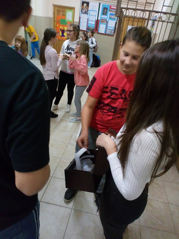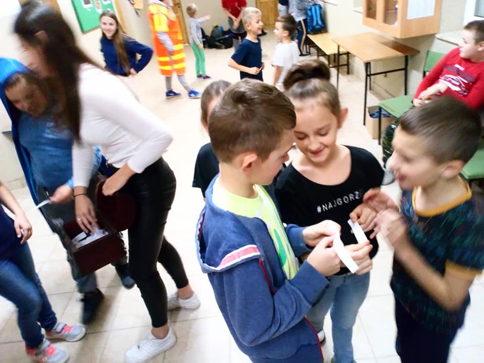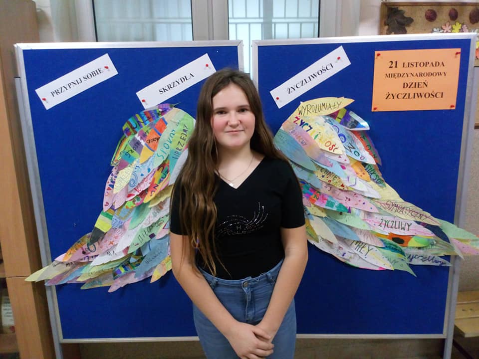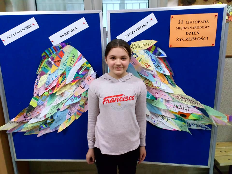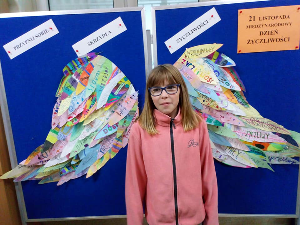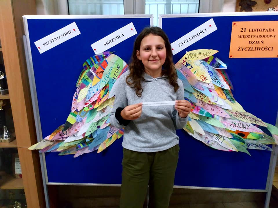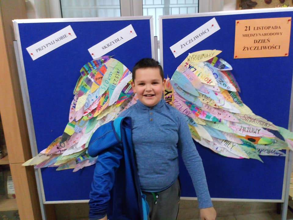 21 listopada obchodziliśmy w naszej szkole Dzień Życzliwości. Od poniedziałku korytarze szkolne zdobią plakaty propagujące tę wartość. Każdy uczeń wykonał i ozdobił pióro z jedną, pozytywną ludzką cechą. Z piór SU wykonał wielkie skrzydła życzliwości, które zawisły na korytarzu szkolnym. Dzisiaj, na długich przerwach chętni losowali z Kufra Gestów Życzliwości zadania do wykonania. Zabawa cieszyła się bardzo dużym zainteresowaniem. Kto wykonał zadanie, mógł sobie "przypiąć" skrzydła i zrobić z nimi zdjęcie. Okazało się, że wszystkim z nimi do twarzy!