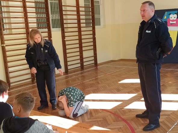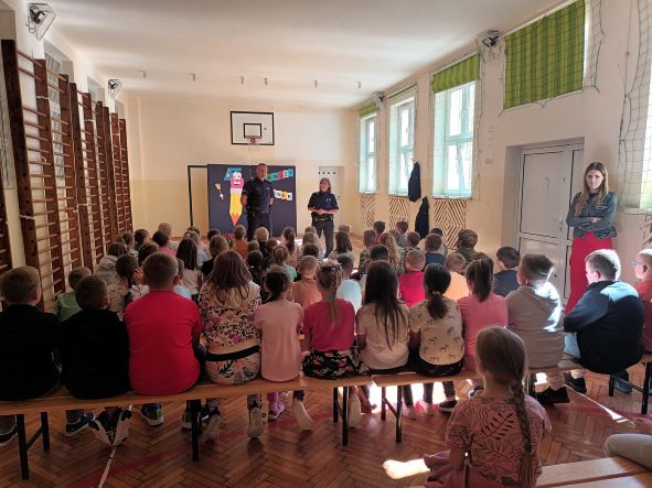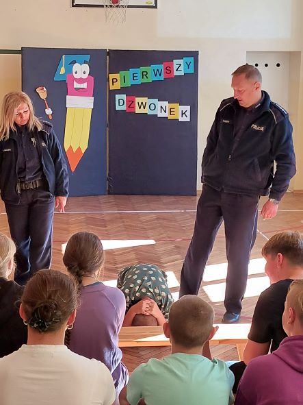 6 września odbyło się spotkanie z policjantami, w którym uczestniczyli uczniowie wszystkich klas oraz przedszkolaki. Policjanci przypomnieli zasady bezpiecznego poruszania się po chodnikach i ulicach oraz przepisy drogowe dotyczące rowerzystów. Omówili sposoby bezpiecznego przechodzenia przez przejścia dla pieszych oraz poruszania się po zmroku. Warto pamiętać o odblaskach! Odbył się pokaz przyjmowania prawidłowej pozycji żółwia w przypadku ataku psa. Zwrócono także uwagę na właściwe sposoby reagowania w przypadku bycia zaczepianym przez nieznajome osoby. Takie spotkanie do dobry start w nowy rok szkolny pod znakiem bezpieczeństwa.