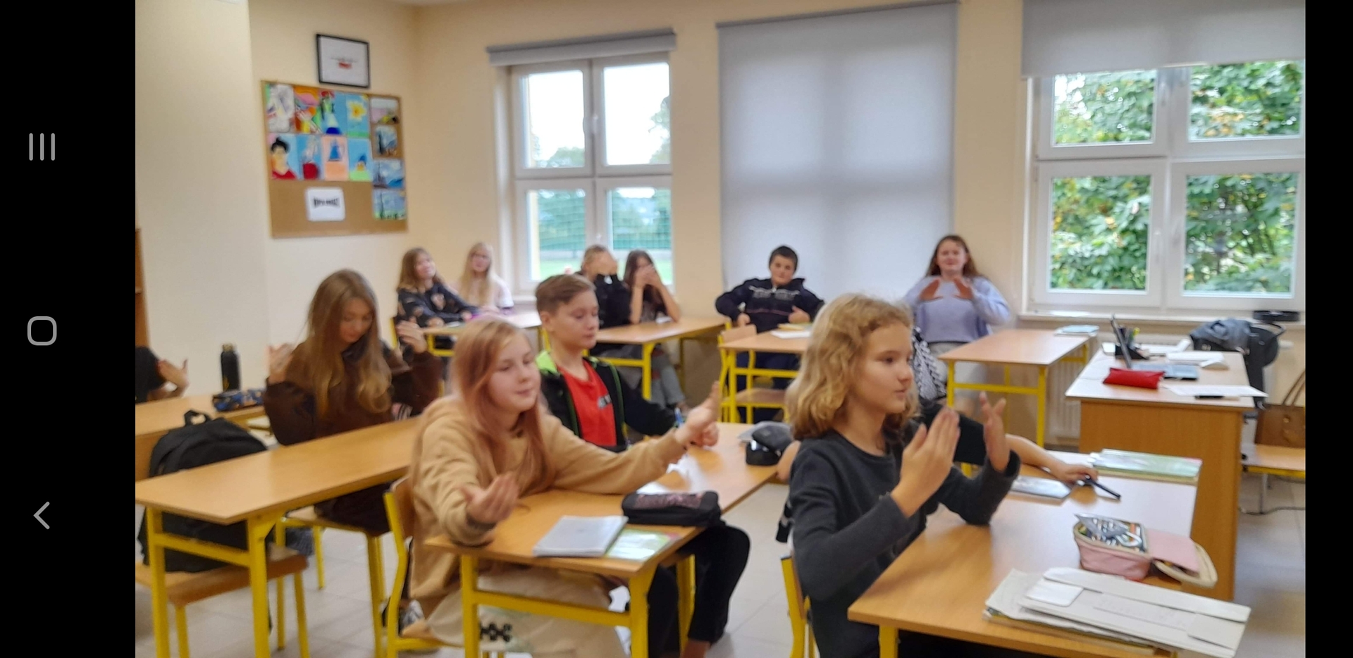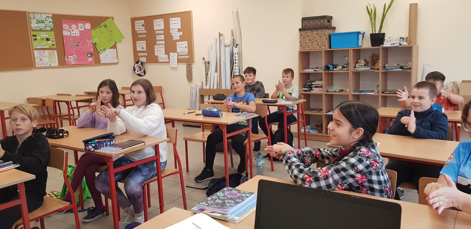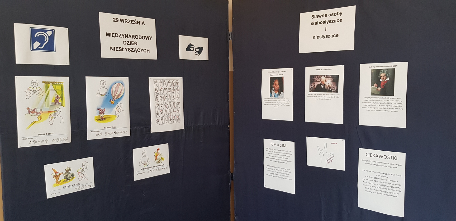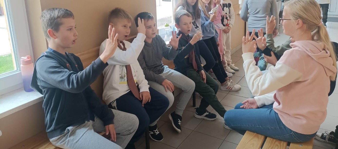 29 września w ramach Ogólnopolskiego Projektu Edukacyjno- Społecznego "Każdy inny- wszyscy równi" w naszej szkole obchodziliśmy Międzynarodowy Dzień Osób Niesłyszących. Z tej okazji w klasie III, V i VI pani Paulina Majsterek przeprowadziła zajęcia, w ramach których dzieci uczyły się alfabetu palcowego oraz podstawowych zwrotów w Polskim Języku Migowym.
