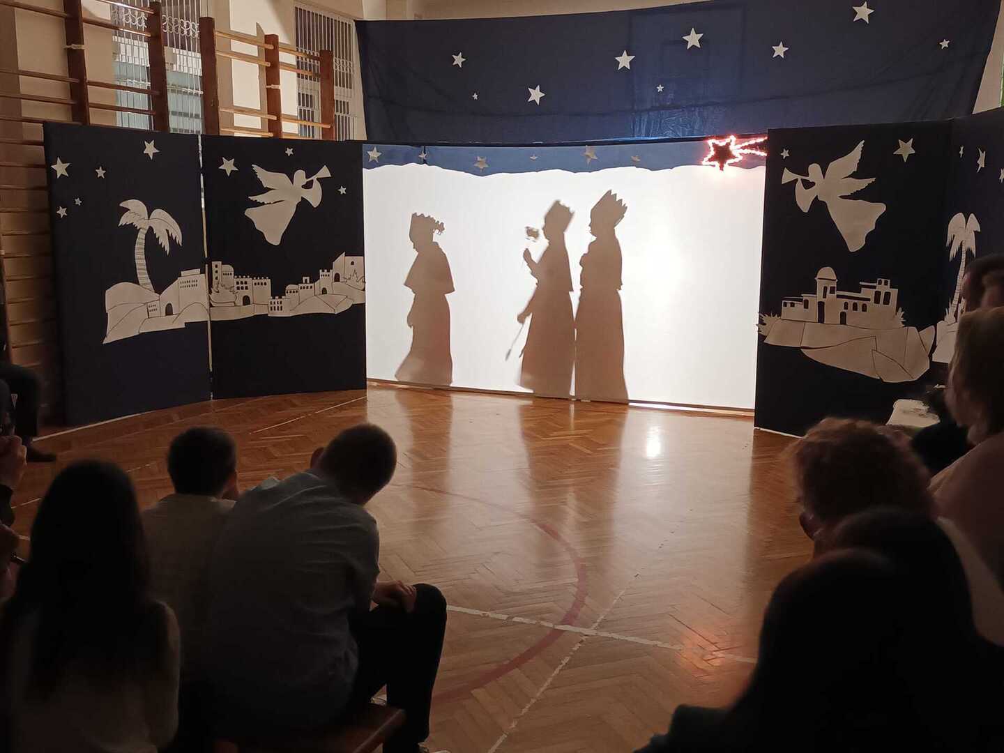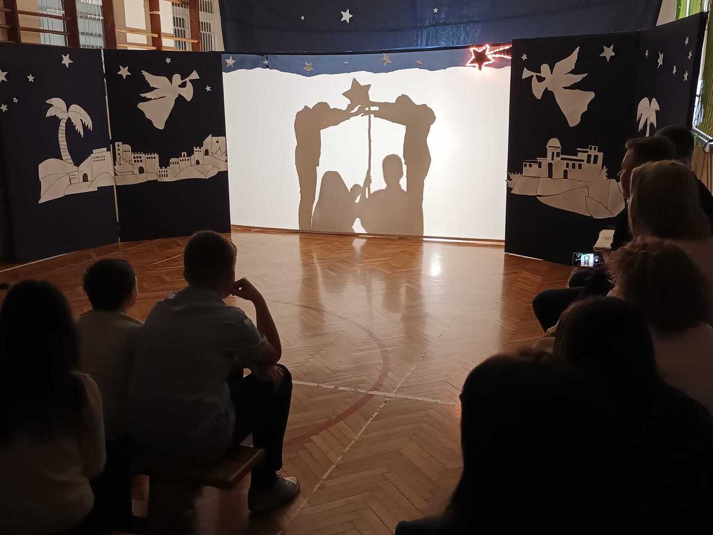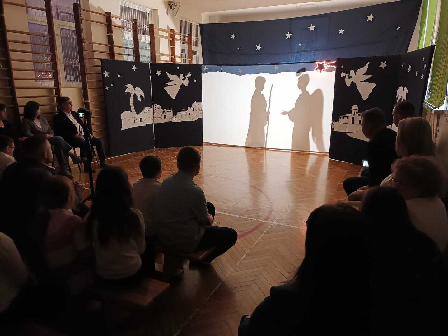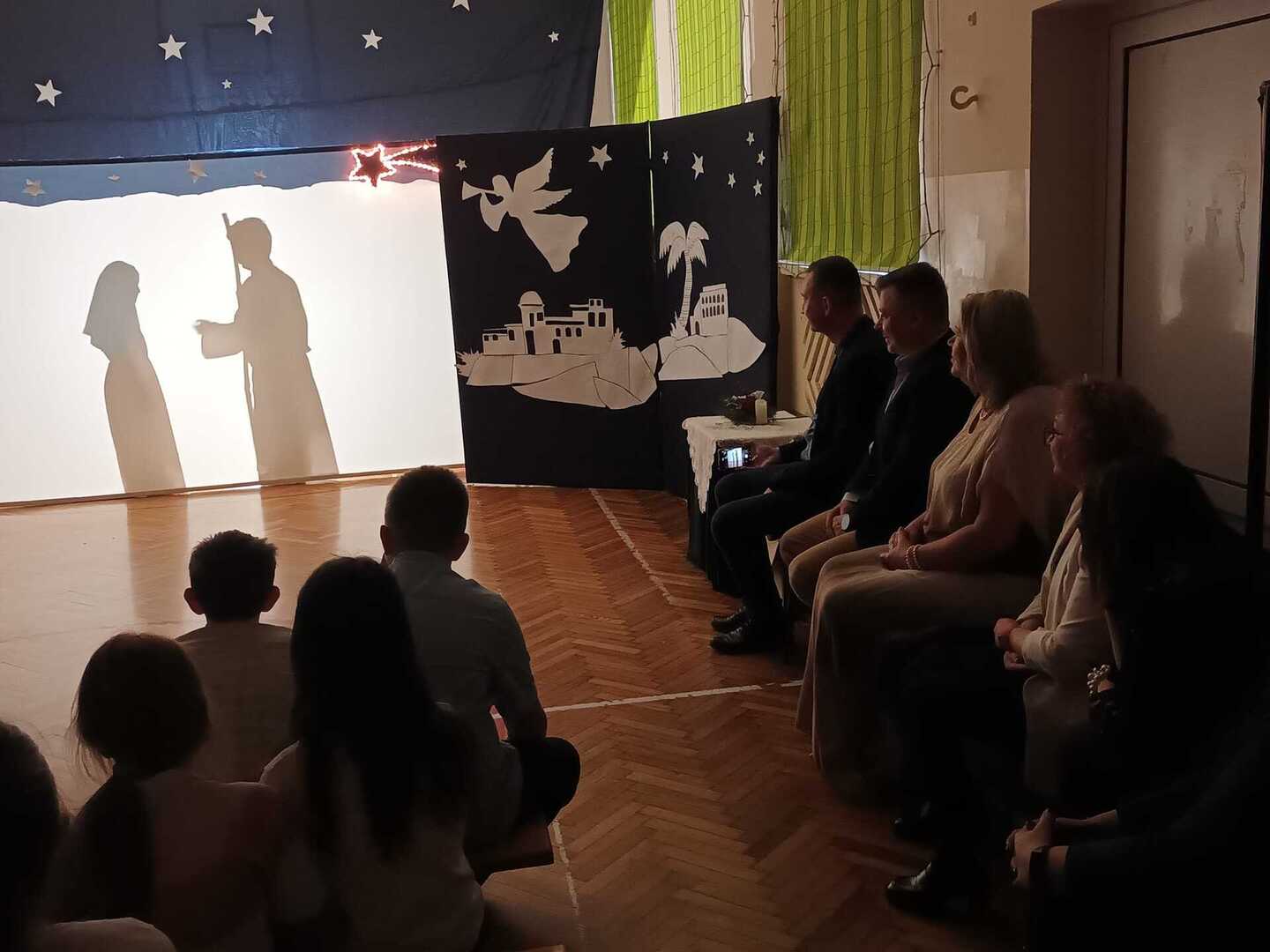 19 grudnia jasełka obejrzeli uczniowie klas I-III. W tym roku przybrały one formę teatru cieni. W nowoczesny sposób opowiedziały o narodzeniu Jezusa. Przedstawienie bez słów wzbogacił piękny śpiew szkolnego zespołu wokalnego. W przedstawieniu bożonarodzeniowym wystąpili uczniowie klasy: 3, 5 i 7 przygotowani przez nauczycielki świetlicy , panie: Agnieszkę Bielak, Agnieszkę Fudalej i Magdalenę Staszczyk, która przygotowała oprawę muzyczną i wokalną. 20 grudnia widowisko mieli okazję zobaczyć uczniowie klas starszych oraz zaproszeni goście: wójt Gminy Wólka Pan Edwin Gortat, Kierownik Referatu ds oświaty Pani Elżbieta Skiba oraz przedstawiciele instytucji zaprzyjaźnionych z naszą szkołą - przedstawicielka Gminnej Biblioteki Publicznej w Wólce - Pani Anna Bobel - Żydek, przedstawiciele Centro- chem i Kamieniarstwo Grantur i Pan Konrad Krupski Rozmaryn Dom Weselny. Teatr cieni podobał się wszystkim, a oprawa muzyczna wzruszyła oglądających.