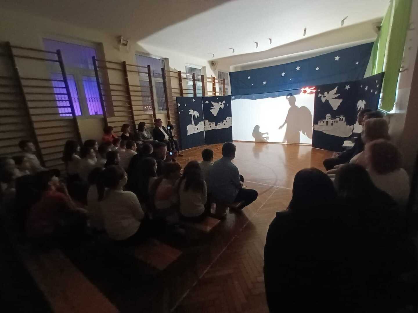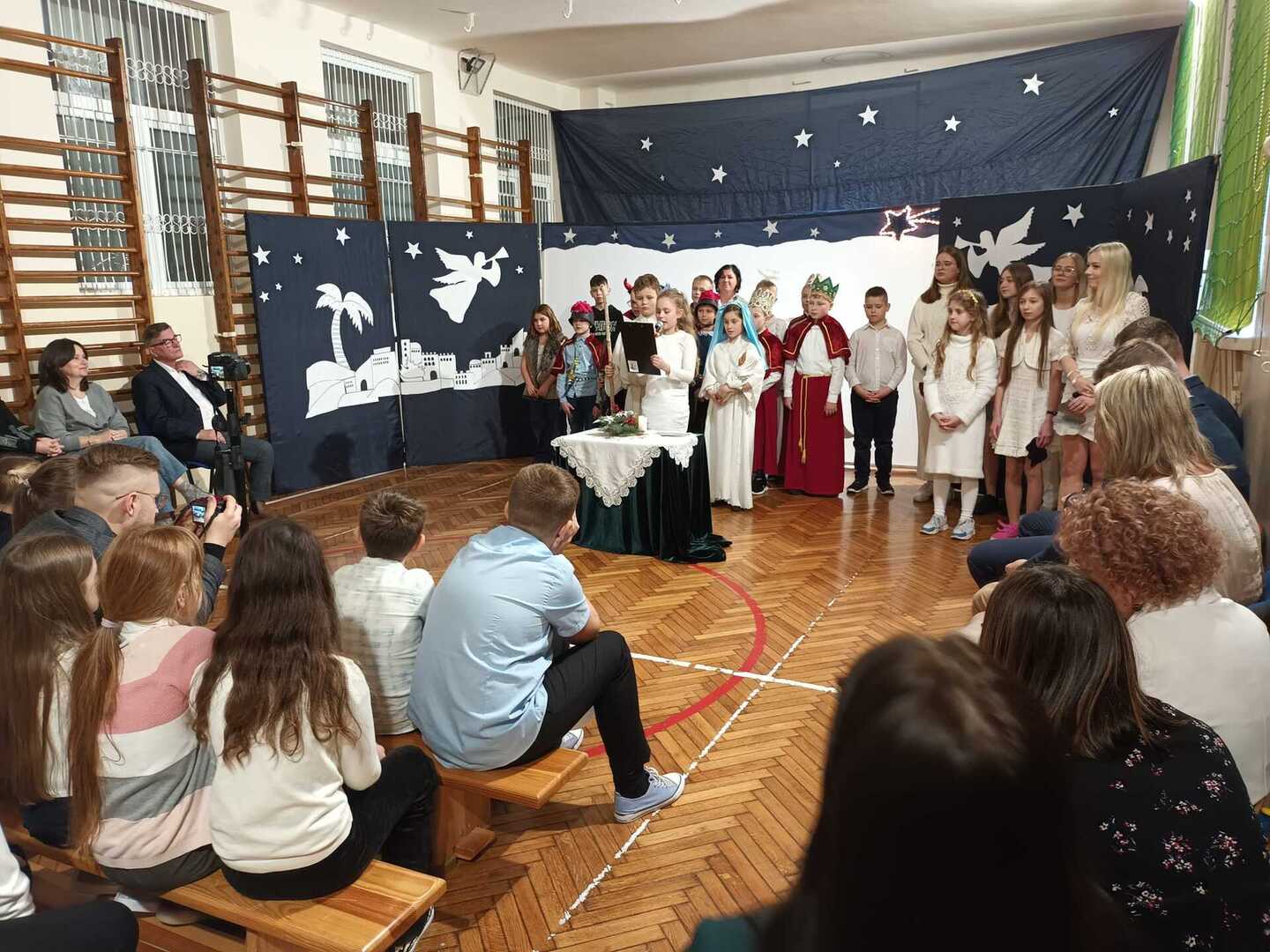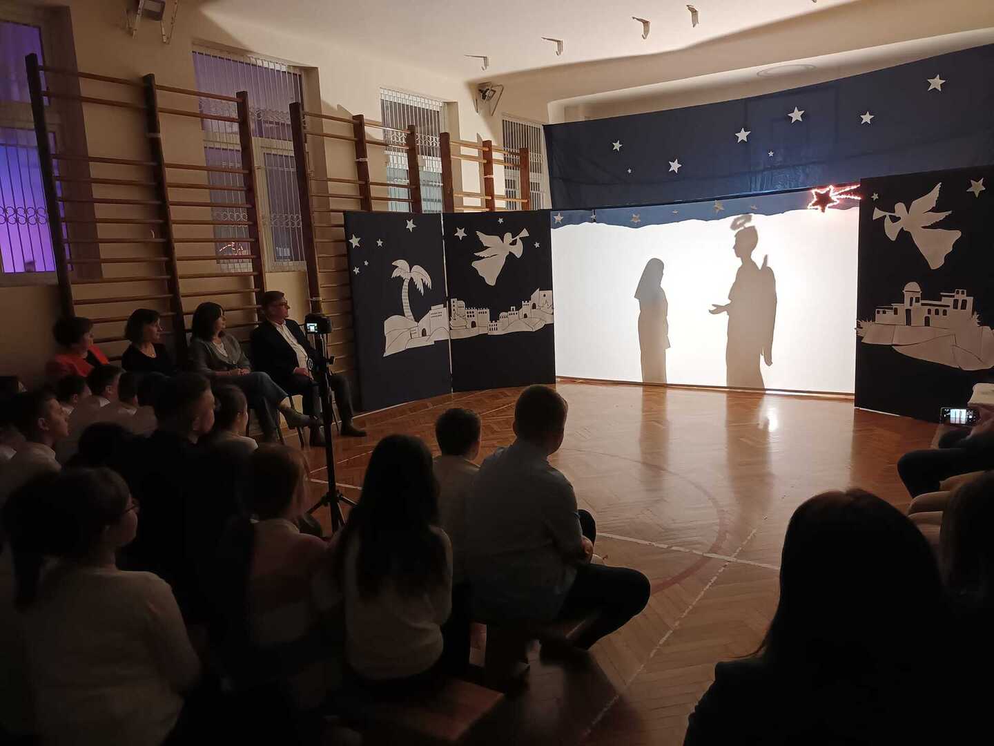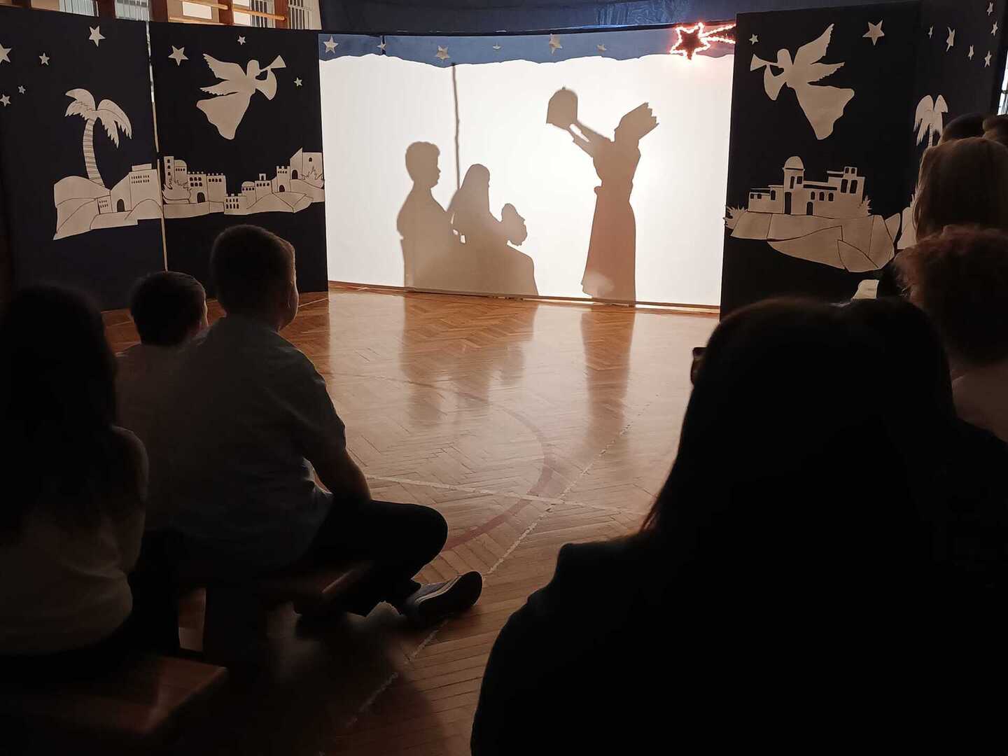 19 grudnia jasełka obejrzeli uczniowie klas I-III. W tym roku przybrały one formę teatru cieni. W nowoczesny sposób opowiedziały o narodzeniu Jezusa. Przedstawienie bez słów wzbogacił piękny śpiew szkolnego zespołu wokalnego. W przedstawieniu bożonarodzeniowym wystąpili uczniowie klasy: 3, 5 i 7 przygotowani przez nauczycielki świetlicy , panie: Agnieszkę Bielak, Agnieszkę Fudalej i Magdalenę Staszczyk, która przygotowała oprawę muzyczną i wokalną. 20 grudnia widowisko mieli okazję zobaczyć uczniowie klas starszych oraz zaproszeni goście: wójt Gminy Wólka Pan Edwin Gortat, Kierownik Referatu ds oświaty Pani Elżbieta Skiba oraz przedstawiciele instytucji zaprzyjaźnionych z naszą szkołą - przedstawicielka Gminnej Biblioteki Publicznej w Wólce - Pani Anna Bobel - Żydek, przedstawiciele Centro- chem i Kamieniarstwo Grantur i Pan Konrad Krupski Rozmaryn Dom Weselny. Teatr cieni podobał się wszystkim, a oprawa muzyczna wzruszyła oglądających.